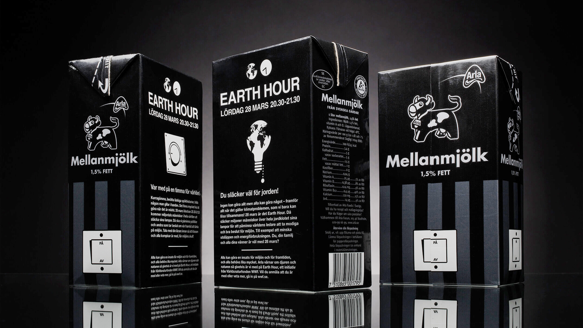 Inför Earth Hour 2009 ville Arla uppmärksamma evenemanget i samarbete med WWF, och sätta fokus på företagets långsiktiga miljöarbete. Vår lösning blev att släcka ner de traditionella, vita mjölkpaketen som varit oförändrade sedan 1991.