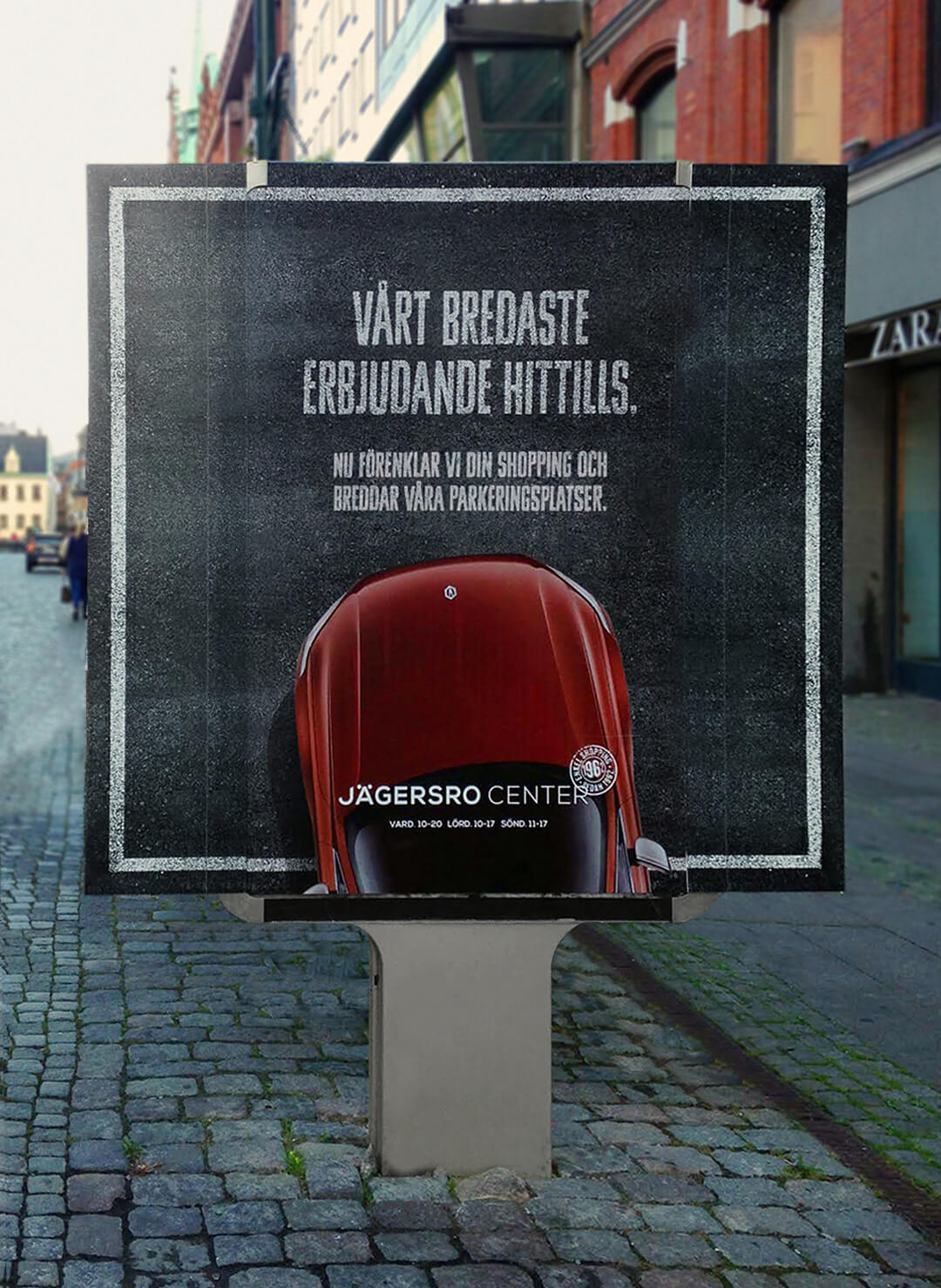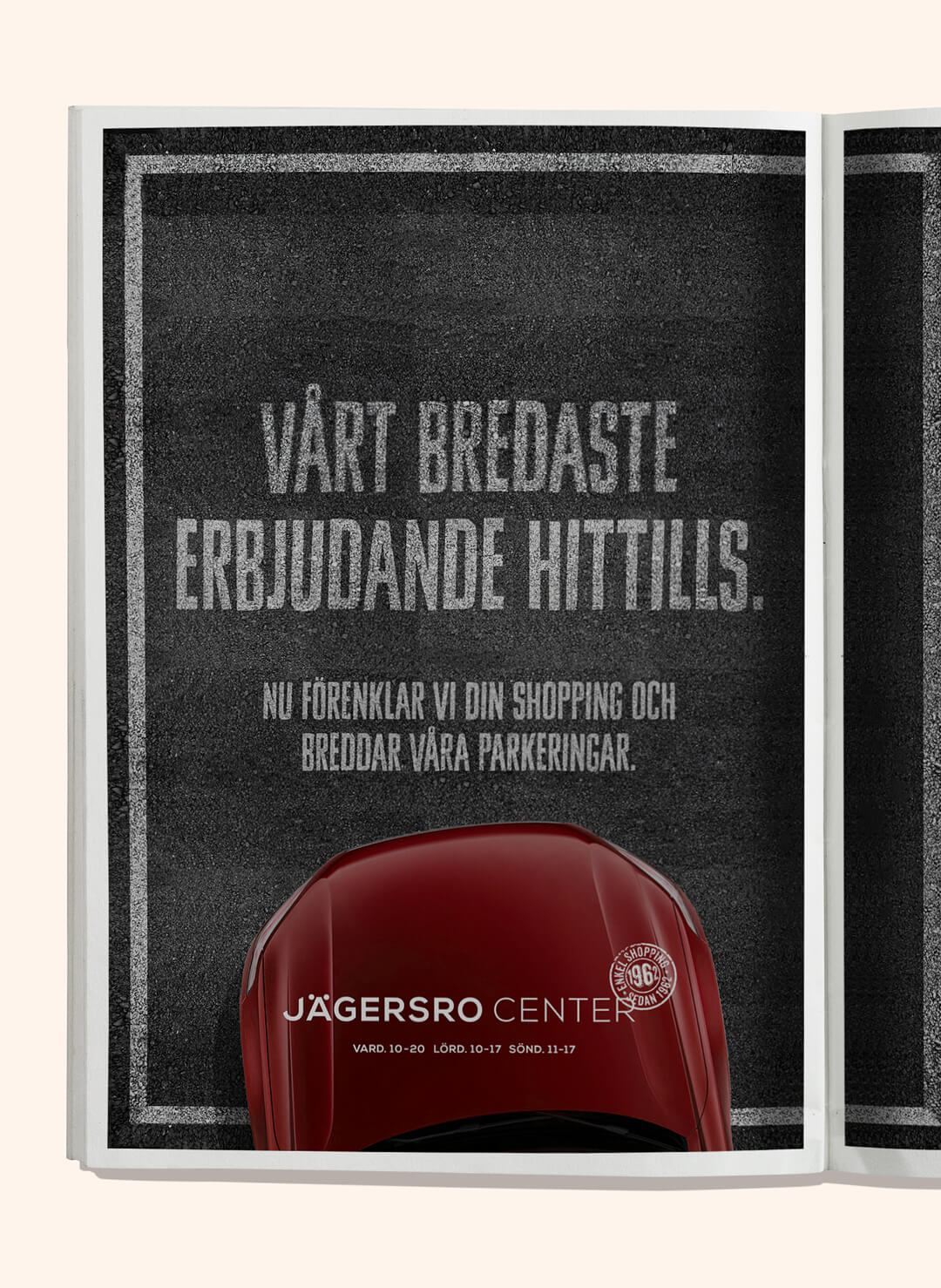 Som ett sätt att förenkla shoppingen på Jägersro Center breddade man parkeringsplatserna med 60 cm. Jägersro Centers bredaste erbjudande någonsin fick tyvärr inte plats på det vanliga utrymmet. Därför fick vi bygga ut utomhustavlorna i Malmö och helsidesannonserna i Skånska Dagbladet för att få plats.