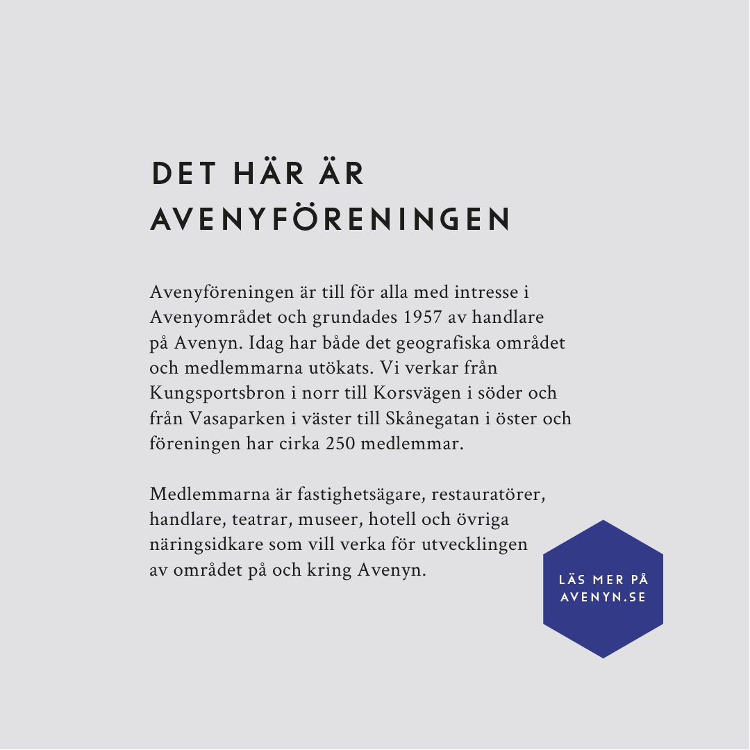 Avenyföreningen grundades 1957 och har cirka 250 fastighetsägare, restauratörer, handlare, teatrar, museer och hotell som medlemmar. Syftet är dels att utveckla den fysiska platsen, och dels att ge varumärket Avenyn en tydlig röst. Vårt uppdrag var att ge varumärket en modern identitet som linjerar med den framtida visionen för området.