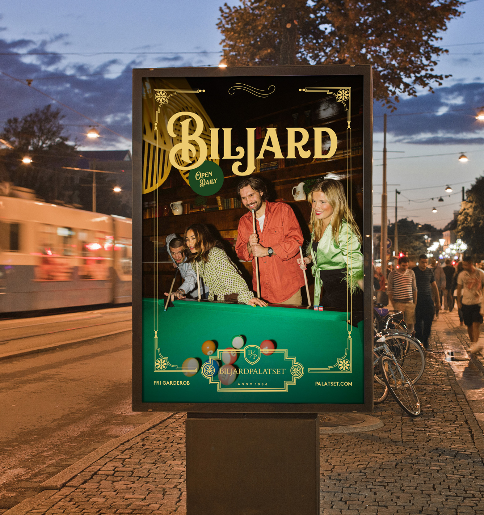 I över 40 år har Biljardpalatset varit en destination för after work, söndagsmiddagar, dejter, konferenser, cocktails och det rustika franska köket. Och biljard förstås. För att få fler att upptäcka hela utbudet – som mat, möten och stans längsta vinlista – tog vi fram ett koncept som lyfter fram det sociala tillsammans med det sportsliga.