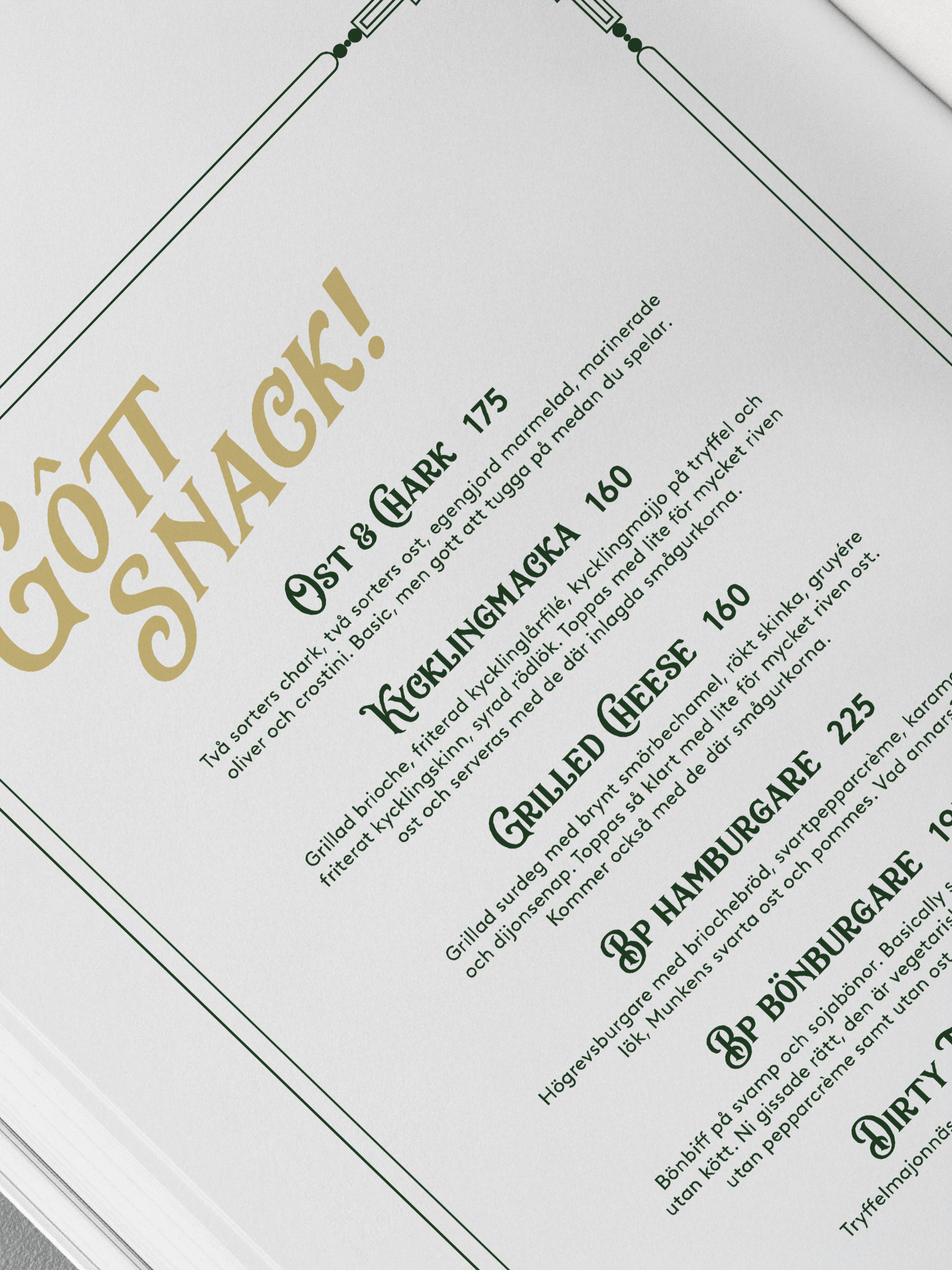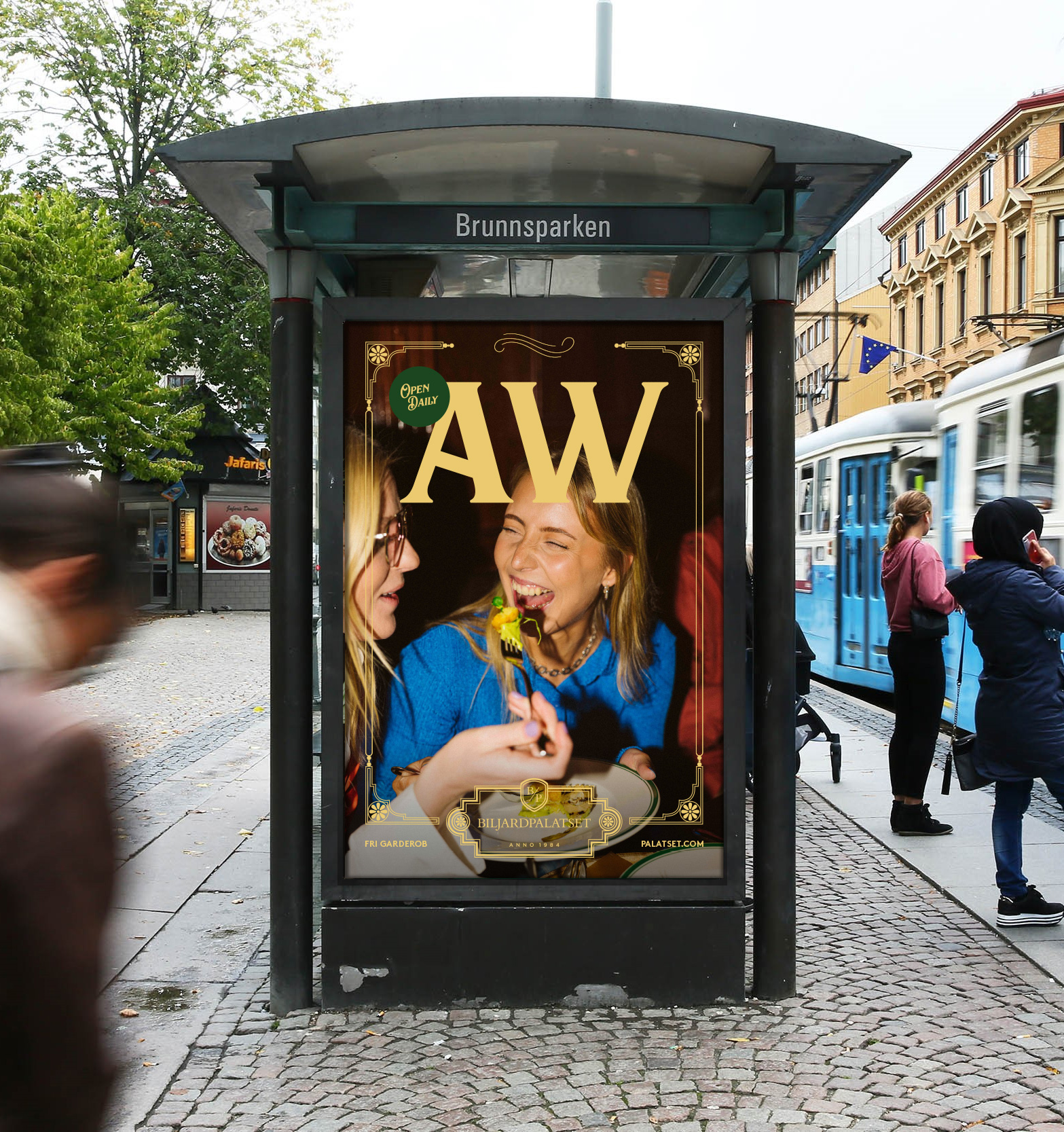 Vår första leverans var en uppdaterad visuell identitet som tydligare förpackar Biljardpalatsets erbjudande i alla kanaler och sammanhang. Från menyer och platskommunikation till utomhusytor och sociala medier.