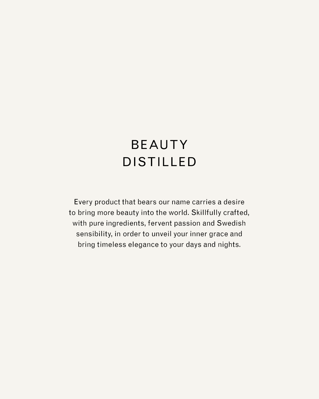 The concept ”Beauty Distilled” is made to function as a guideline for all verbal and visual communication, connecting brand, category and product messaging across all touch points during the customer journey. Allowing the brand to focus on it’s aesthetic roots in the Swedish Grace period, the artisanal process or a specific product. Or communicating all three at the same time if needed.