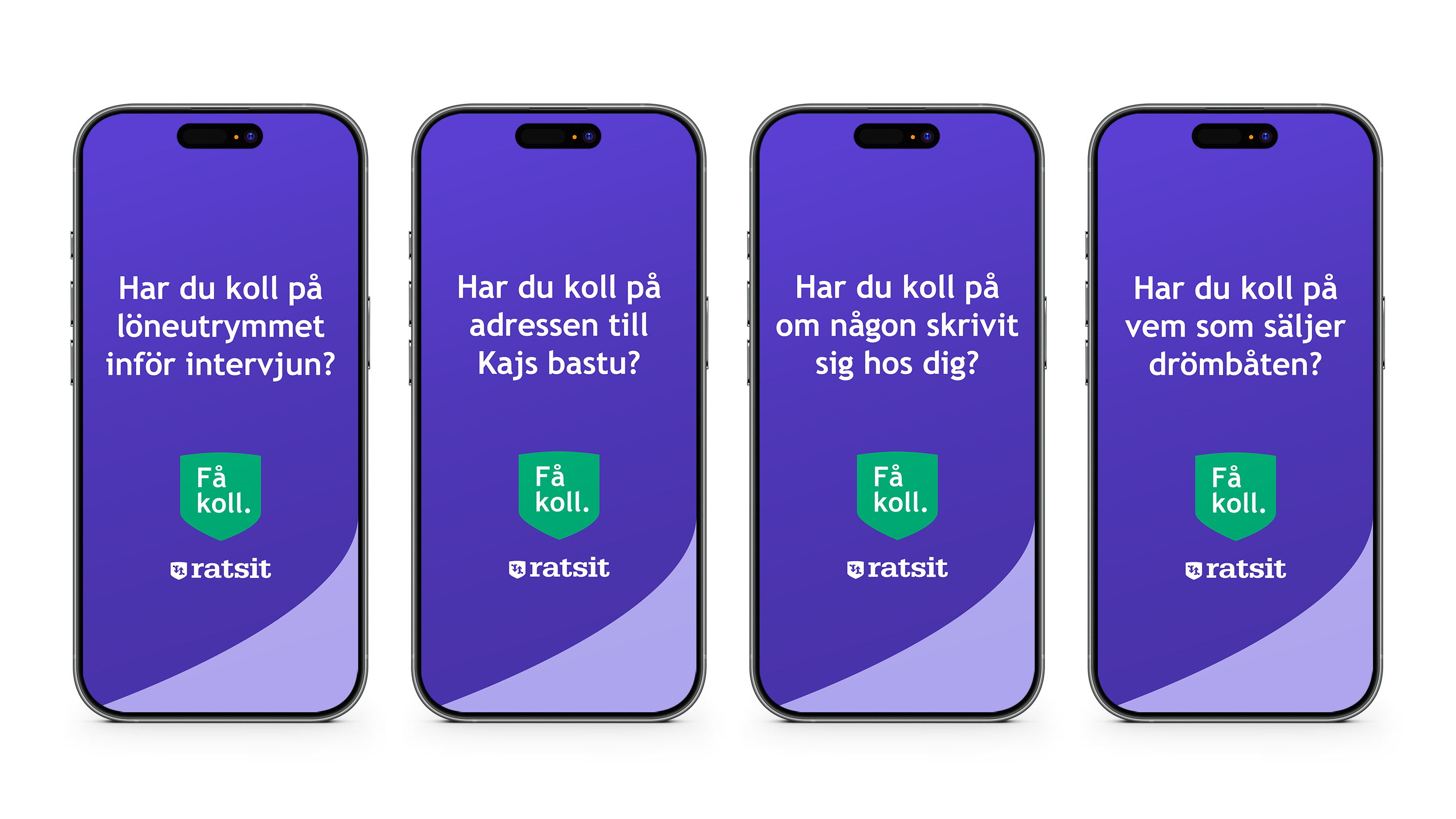 Första steget mot en ny position var att vrida på varumärkets löfte. Genom att flytta fokus från ”kolla upp” till ”få koll” öppnar vi för ett bredare sätt att kommunicera, som gör Ratsit relevanta för fler målgrupper och sammanhang. Från nyfikenhet på enskilda individer till en tjänst som ger dig koll på alla du gör affärer med, hjälper dig göra prognoser inför karriärbytet och bidrar till en mer rättvis lönesättning på arbetsmarknaden. I samband med det nya konceptet renodlade vi den visuella identiteten, för att ge erbjudandet en mer modern, tydlig och sammanhängande inramning.